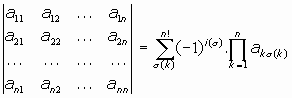 "resulta ser la suma de los productos de los elementos de la tabla de forma que en cada producto hay un elemento de cada fila y un elemento de cada columna, estando cada producto afectado por el signo correspondiente a la signatura de la permutación de los segundos subíndices cuando los primeros se encuentran en permutación principal"