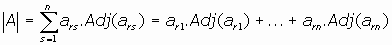 Esto quiere decir que un determinado término, ars, está en un total de (n-1)! sumandos del desarrollo de los n! sumandos y en cada uno de ellos figura multiplicando a n-1 factores que son uno de cada fila y uno de cada columna de las restantes filas y columnas (filas distintas de la fila r y columnas distintas de la columna s), estos es, ars figura multiplicando a los (n-1)! sumandos del desarrollo de un determinante en donde se ha suprimido al fila r y la columna s, o sea, el adjunto del elemento ars, y como esto se puede hacer para cualquiera de los elementos de una misma línea, ya sea fila o ya sea columna, resulta que cualquier determinante puede desarrollarse por los elementos de una línea al sacar estos factor común en todo el desarrollo, quedando, en definitiva, una expresión del tipo: