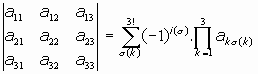 "la suma de los productos de las componentes de ambos vectores afectados por el signo correspondiente a la signatura de la permutación de los segundos subíndices cuando los primeros subíndices se encuentran en permutación principal".