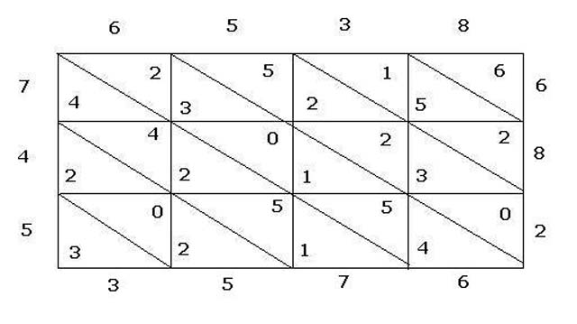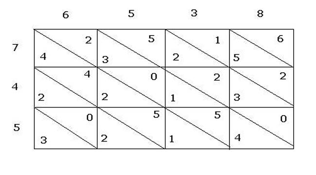 Luego dividimos cada casilla del cuadro en dos mitades trazando una diagonal que une su vértice superior izquierdo con su vértice inferior derecho. Luego, en cada casilla inscribimos el producto de las dos cifras que encabezan la línea y la columna correspondiente. Este producto es, por supuesto, inferior a 100: escribimos la cifra de sus decenas en la mitad inferior de la casilla izquierda y la de sus unidades en la mitad superior de la casilla de la derecha. Y si faltara alguno de estos órdenes de unidades, bastaría entonces con colocar un cero en la mitad de la casilla correspondiente.