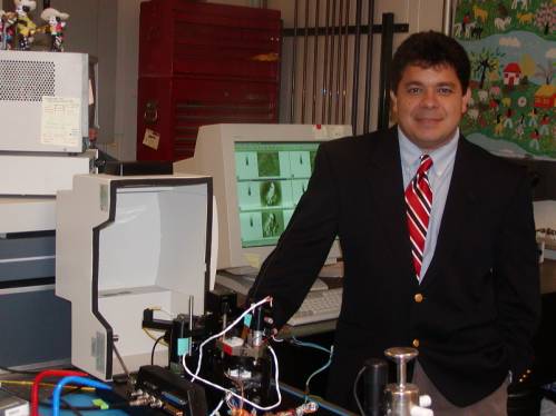 El Dr. Luis Francisco Garfias al lado de su microscopio NSOM, Microscopio de Barrido en el Campo Corto o (Near-Field Scanning Optical Microscope) que utiliza para hacer estudios de microscopio en nuevos materiales.Durante mi postdoc trabajé con un microscopio para que pudiera "ver" células vivas sin modificarlas o "interrumpirlas". Su característica primordial es que se puede estudiar cualquier tipo de materiales (metales, células, ya sea conductores o no conductores) se puede hacer en aire, gases o en líquidos, no es necesario el vacío como en el microscopio electrónico de barrido. O incluso no necesita que las muestras sean conductoras. Para mi labor de investigación lo que me tocó hacer fue modificar el microscopio NSOM y hacerlo funcionar dentro de un líquido, lo cual considero una de mis mejores contribuciones a la ciencia, ya que de esta forma comprobamos que se pueden hacer diversos experimentos. La primera experiencia práctica en Minnesota fue con materiales para implantes al estudiar los sitios reactivos o más vulnerables a la corrosión cuando se colocan en un paciente y vinculamos el proyecto con la NSF, (Nacional Science Fundation). Con este microscopio localizamos los sitios donde había la mayor probabilidad de que el metal fallara debido a la corrosión.
