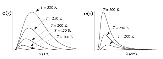a la que aparece el máximo de la curva cuando la temperatura sube a los 300 K. La situación es como si el máximo se desplazara hacia la izquierda al aumentar la temperatura absoluta.