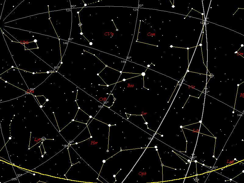 Sobre el día 11 ya se puede ver a esa hora la constelación de Hercules sobre el horizonte. Sobre las 12 de la noche de estos dias centrales del mes se observa ya la salida de Lyra y de la constelación de Ofiuco, asi como las primeras estrellas del Cisne (Cruz del Norte).