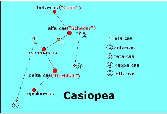 Existen además en Casiopea algunos cúmulos abiertos, entre los que destacan M52 y M103.- 1. eta-cas, mag. visual = 3.44
