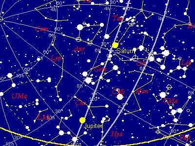 El dia 15 de diciembre el planeta y su corte de satélites se encontrará en las proximidades de las coordenadas ecuatoriales 09222+1608, en la constelación de Leo.