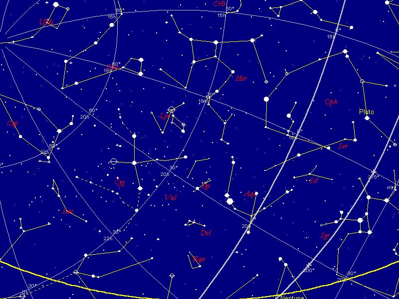 En cuanto al Cisne, una de las constelaciones veraniegas más emblemáticas, tiene por estrella principal a Deneb, en la cola del Cisne, estrella que junto con la alfa-Lyr, Vega, y la alfa-Agl, Altair, forman el llamado "triángulo del verano". Deneb es una estrella mucho más luminosa que nuestro Sol, del órden de las 10.000 veces, y está situada a unos 1500 años luz de distancia. Su magnitud visual es de 1.25. Se encuentra en las coordenadas ecuatoriales 20h41m31s, +45º16'58".