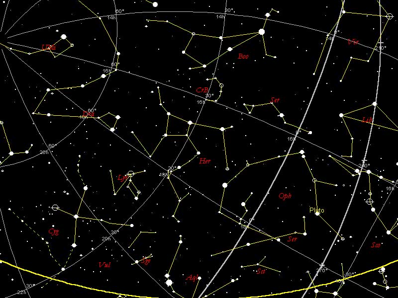 Aparición de nuevas constelaciones:Si observamos las imagenes, en ambas direcciones, norte y este, para el dia 15 del mes, vemos que están en posición optima para enfocar hacia ellas nuestro telescopio las constelaciones de Lyra, Aguilae, Cepheus y Cygnus. Entre estas dos últimas constelaciones puede todavia observarse el cometa Ikeya-Zheng.
