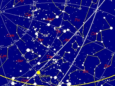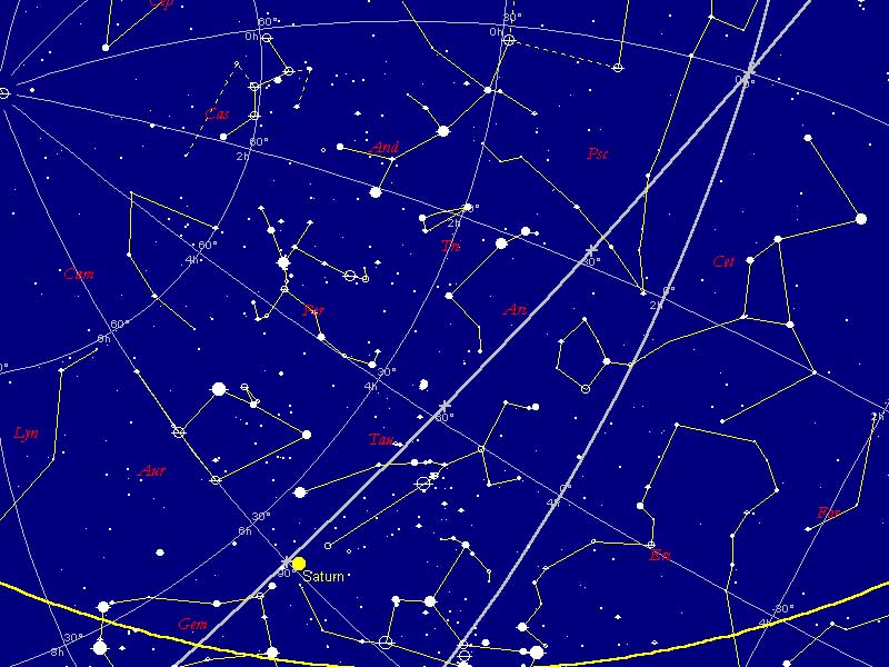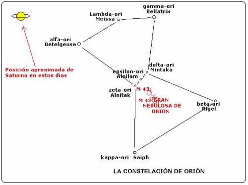 Digamos también que, a estas horas, el planeta Saturno se encuentra observable, distinguiendose facilmente sus anillos con pequeños telescopios. Está situado entre las constelaciones de Tauro, de Gémini y de Orion, en una situación aproximada, a las 23:30 horas de la noche en Andalucia, de 05h55m08s, +22º07'.
