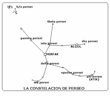 - La beta-persei, conocida como Algol, es una estrella singular. Se encuentra en las coordenadas ecuatoriales 03h08m19s, +40º58', en el brazo superior de la "K". Se trata de una de las estrellas variables eclipsantes mejor estudiadas a la fecha, pues se sabe, por ejemplo, que mantiene una magnitud visual de 2.2. durante un periodo de 2 dias, 20 horas y 48 minutos, pasando entonces en un intervalo de cinco horas a una magnitud aparente de 3.4 que mantiene durante unos 20 minutos. A continuación, comienza a aumentar la luminosidad y al cabo de otras 5 horas vuelve a tener la magnitud de 2.2. Fué en el año 1782 cuando el astrónomo Jhon Goodricke (1764-1786) formuló la primera hipótesis sobre el comportamiento variable de Algol: se trataba de un cuerpo luminoso que pasaba, en movimiento traslacional, delante de otra estrella de mayor luminosidad. Se ha comprobado ya que se trata de una estrella doble física cuyo peridodo rotación coincide con el periodo de luminosidad. Se encuentra a unos 98 años luz de nosostros y la estrella principal es una 100 veces mas luminosa que nuestro sol, mientras que la secundaria es unas dos veces mas luminosa que el sol. Se considera probado, ademas que existen otras compañeras de menor luminosidad, pues se observan algunos picos muy pequeños en las curvas de luminosidad, compañeras dificilmente observables con telescopios de aficionado.